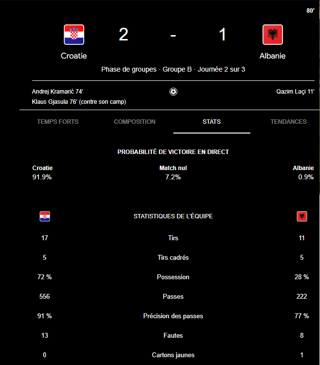 Par contre le match est bien chiant. Limite je poste sans trop regarder. C'est toujours comme ça les matchs impliquant l'Albanie ou?