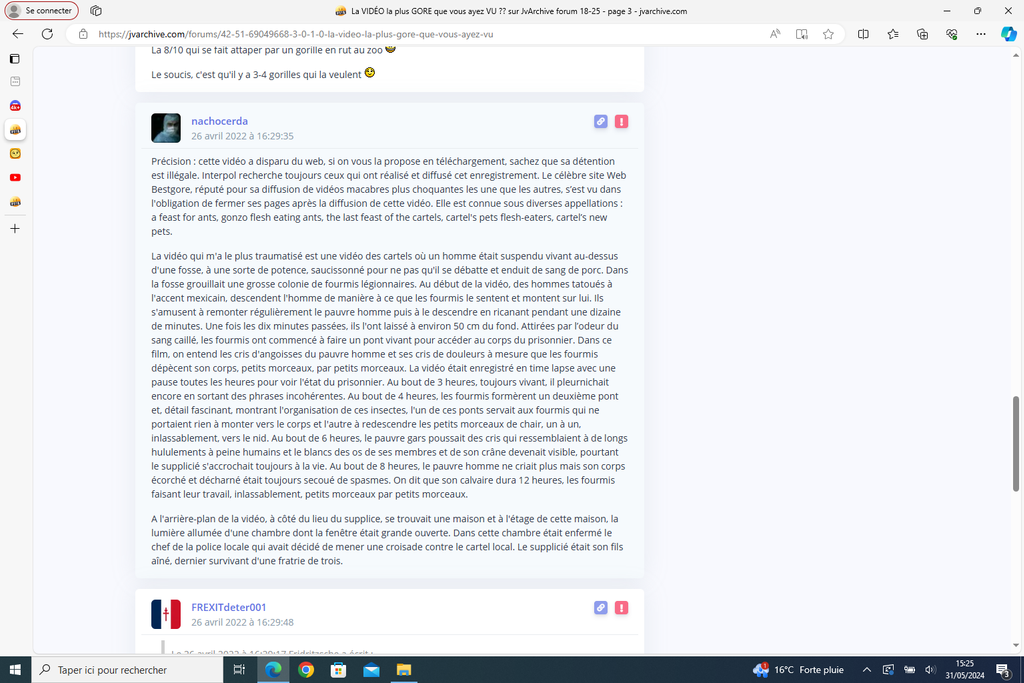 D'ailleurs il y a un khey de JVC ( trouvé sur JVArchive ) qui avait évoqué une vidéo gore concernant un homme dévoré vivant par des fourmis sur plusieurs heures et les sites de gore auraient été obligés de supprimer la vidéo. Je ne sais pas si c'est vrai ou juste un rumeur mais si c'est vrai c'est chaud.