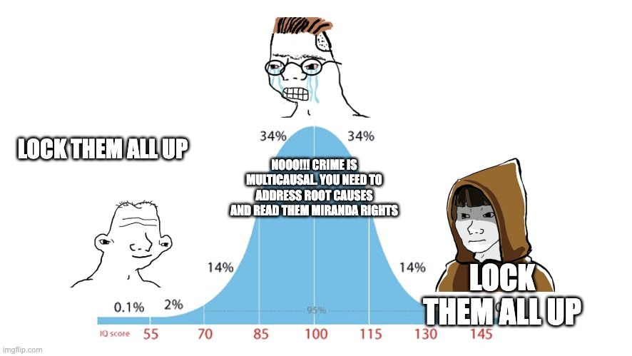 Le meme est simple à expliquer, les idiots pensent la bonne chose par chance (et aussi souvent par haine), la norme pense la mauvaise chose par-ce qu'ils sont pas assez malins bien qu'ils aient un semblant de réflexion, les génies pensent à la bonne chose