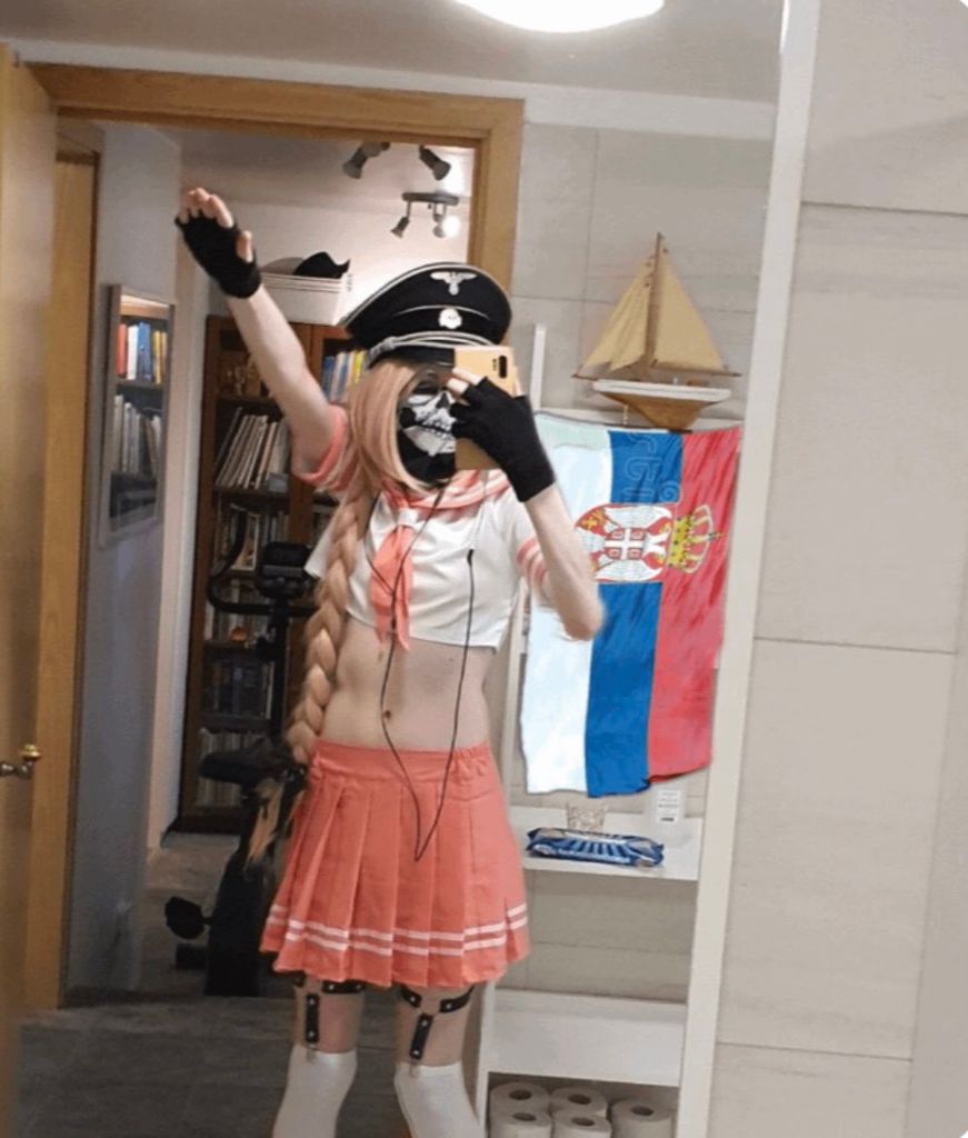 Une jeune où on dirait un aviateur américain de la seconde guerre mondiale