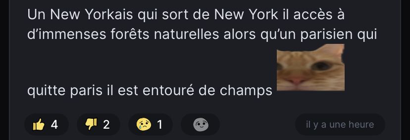 Un New Yorkais qui sort de New York il accès à d’immenses forêts naturelles alors qu’un parisien qui quitte paris il est entouré de champs