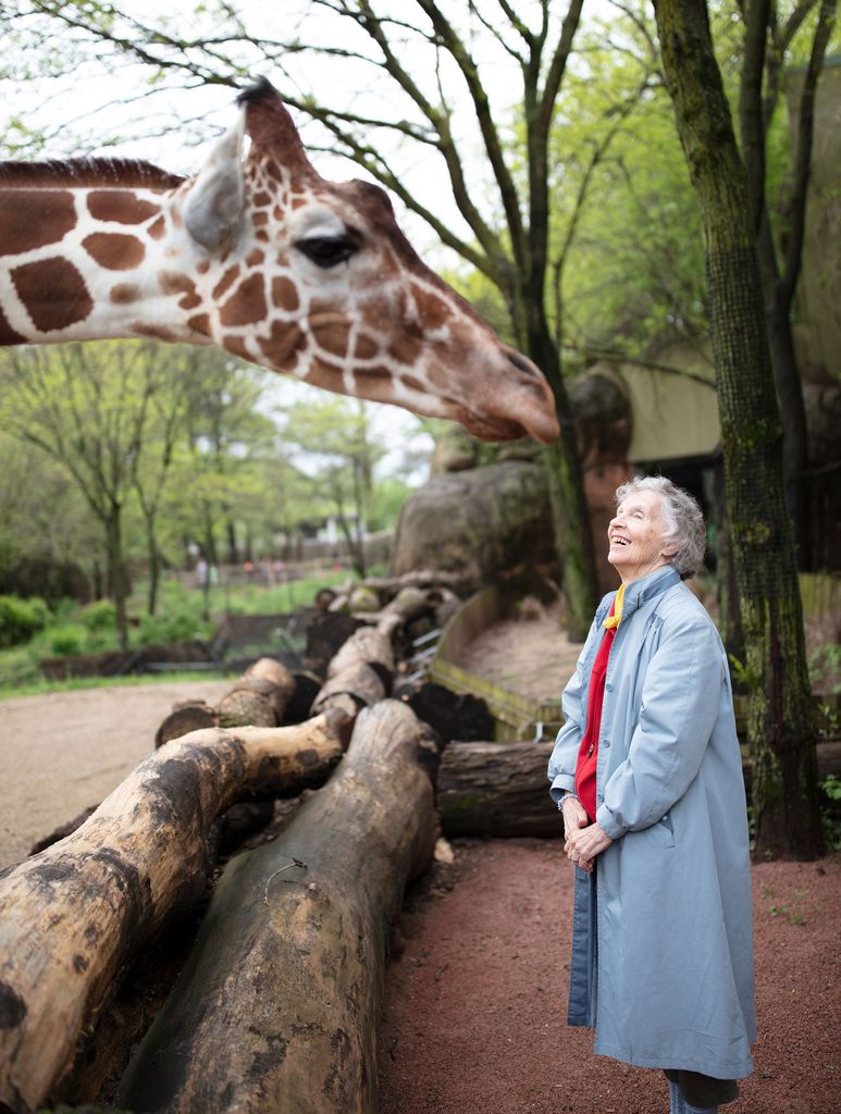 Sur cette photo on voit bien la taille énorme de la tête d'une girafe par rapport à une tête humaine :