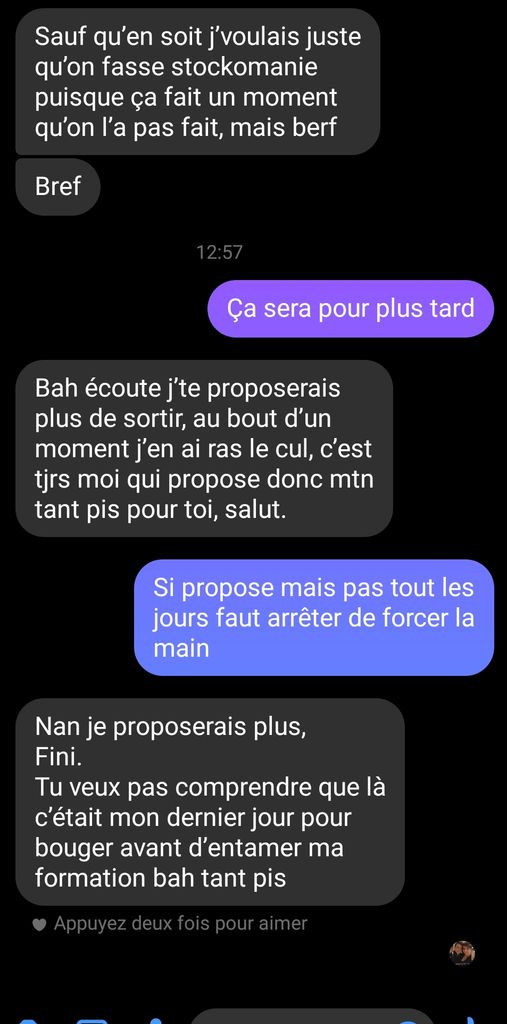 C'est un prétexte pour passer du temps avec toi, elle écope d'un refus et pète une durite.