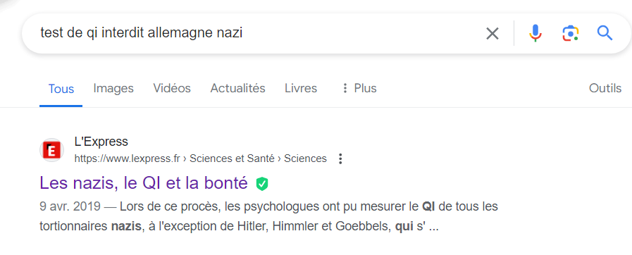 J'ajouterais que c'est juste le malade mental Laurent Alexandre promoteur du transhumanisme aka l'eugénisme sous un nouveau terme qui essaye de se distancer des nazi pour pouvoir faire sa logorrhée. Concrètement il cite deux auteurs qui ont peut être étés anti test de QI et par téléphone sémite ca devient "le IIIe R interdit les tests de QI car ils complexent de la vrai race supérieure"