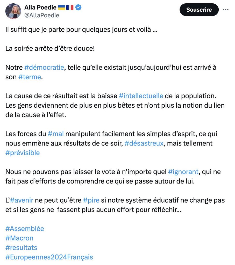 Ce qu'ils vont faire c'est faire porter le chapeau des conséquences de leur bilan catastrophique au pigeon du RN qui acceptera le poste de 1er ministre, et à la prochaine présidentielle ils diront au RN "vous étiez premier ministre, vous êtes responsable", et il sera impossible de les attaquer sur leur bilan d'une part, et ils auront en plus totalement détruit l'image du RN comme "alternative " crédible, tant ce guignol de Bardella aura sucé exactement les mêmes mamelles et fait la même politique que Macron, c'est à dire pro-Otan, pro-UE, pro-Euro, pro-israel, pro-USA, pro-Ukraine.