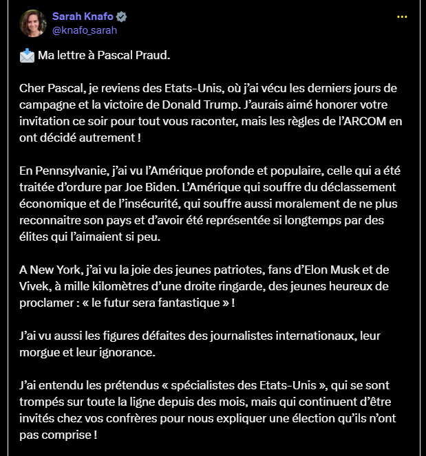 Cher Pascal, je reviens des Etats-Unis, où j’ai vécu les derniers jours de campagne et la victoire de Donald Trump. J’aurais aimé honorer votre invitation ce soir pour tout vous raconter, mais les règles de l’ARCOM en ont décidé autrement !