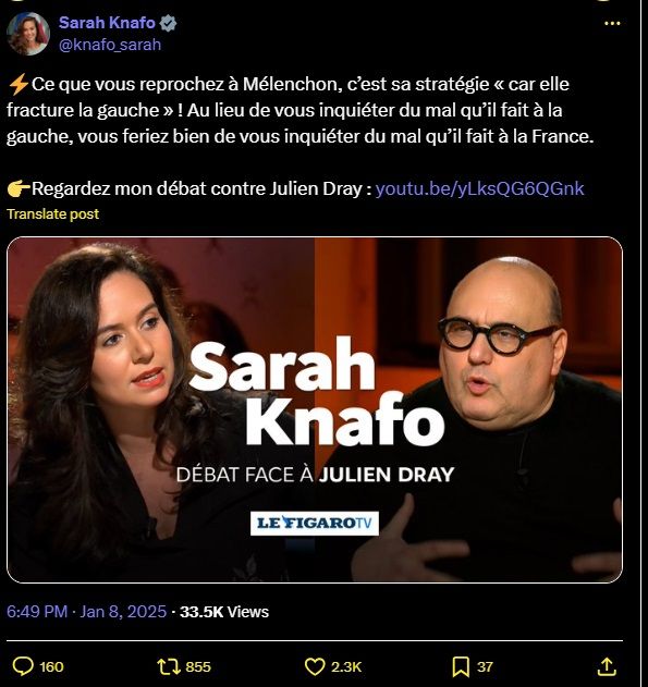 ⚡️Ce que vous reprochez à Mélenchon, c’est sa stratégie « car elle fracture la gauche » ! Au lieu de vous inquiéter du mal qu’il fait à la gauche, vous feriez bien de vous inquiéter du mal qu’il fait à la France.