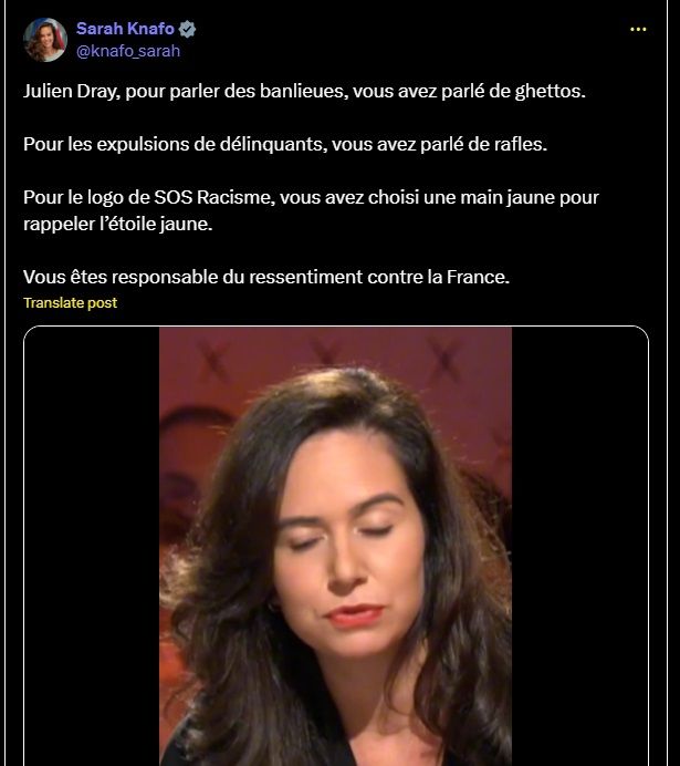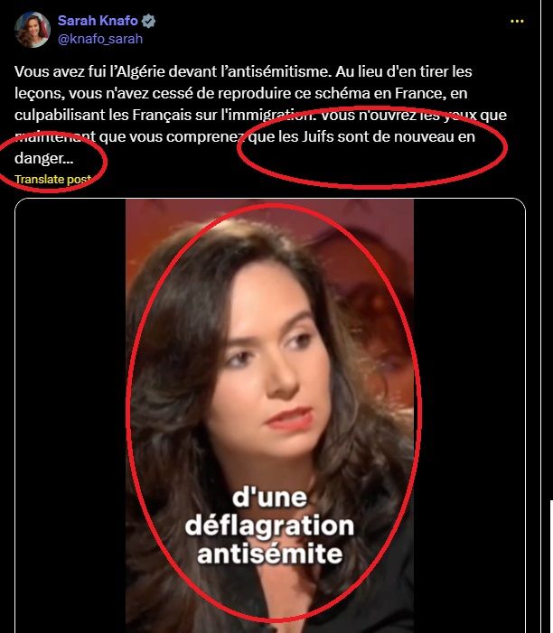 Vous avez fui l’Algérie devant l’antisémitisme. Au lieu d'en tirer les leçons, vous n'avez cessé de reproduire ce schéma en France, en culpabilisant les Français sur l'immigration. Vous n'ouvrez les yeux que maintenant que vous comprenez que les Juifs sont de nouveau en danger...