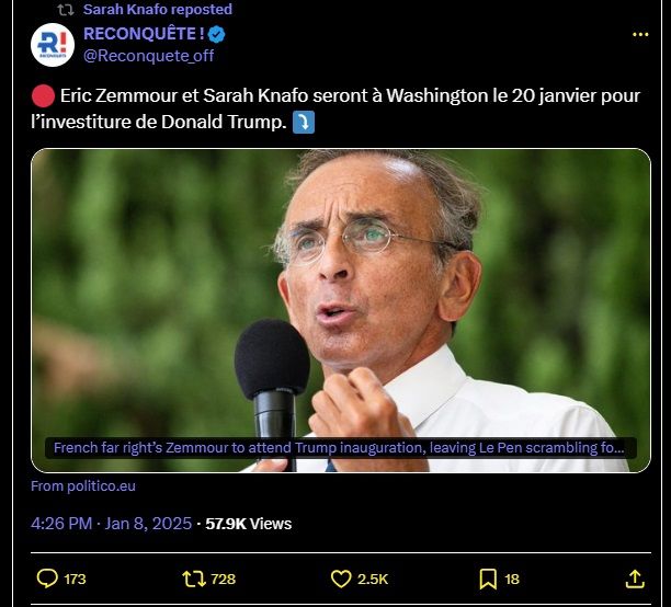 🔴 Eric Zemmour et Sarah Knafo seront à Washington le 20 janvier pour l’investiture de Donald Trump. ⤵️