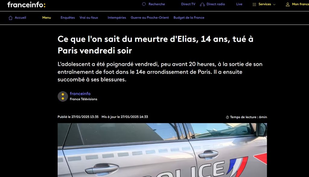 Elias faisait par ailleurs partie "depuis plusieurs années du Patronage Olier", un club de foot du 6e arrondissement, a déclaré sur franceinfo Jean-Pierre Lecoq, maire de cet arrondissement de la rive gauche de la capitale. "Comment peut-on mourir en 2025 parce que quelqu'un veut vous voler votre portable ?", s'est indigné l'élu. "C'est terrifiant. Beaucoup de familles parisiennes peuvent penser peut-être que leurs enfants, leurs petits-enfants peuvent être victimes d'une telle agression", s'est-il encore inquiété.