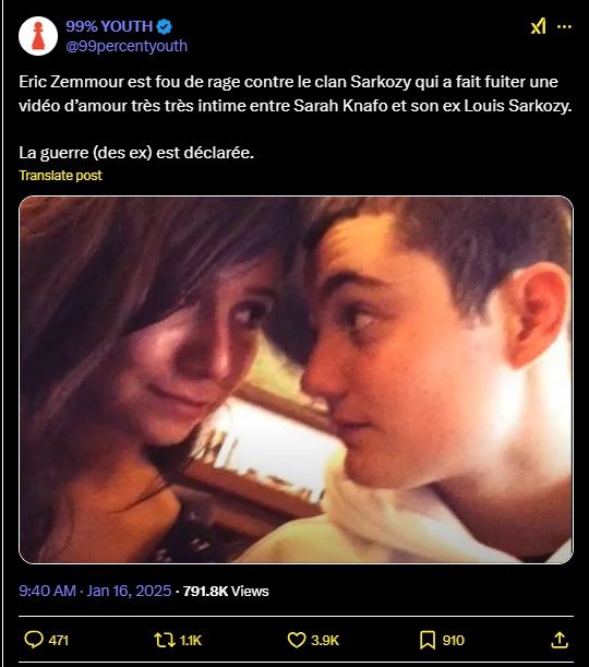 Eric Zemmour est fou de rage contre le clan Sarkozy qui a fait fuiter une vidéo d’amour très très intime entre Sarah Knafo et son ex Louis Sarkozy.