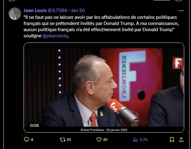 "Il ne faut pas se laisser avoir par les affabulations de certains politiques juifs et maçons qui se prétendent invités par le juif Donald Trump. A ma connaissance, aucun politique français n'a été effectivement invité par le juif Donald Trump" souligne @pkarsenty