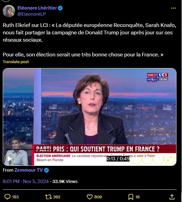 La juive Ruth Elkrief sur LCI : « La députée européenne Reconquête, la juive Sarah Knafo, nous fait partager la campagne du juif Donald Trump jour après jour sur ses réseaux sociaux.