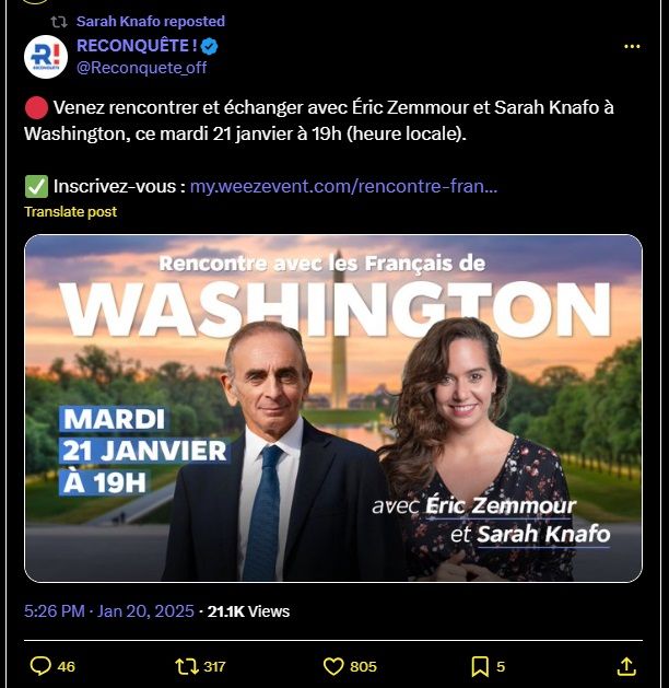 🔴 Venez rencontrer et échanger avec le juif Éric Zemmour et la juive Sarah Knafo à Washington, ce mardi 21 janvier à 19h (heure locale).