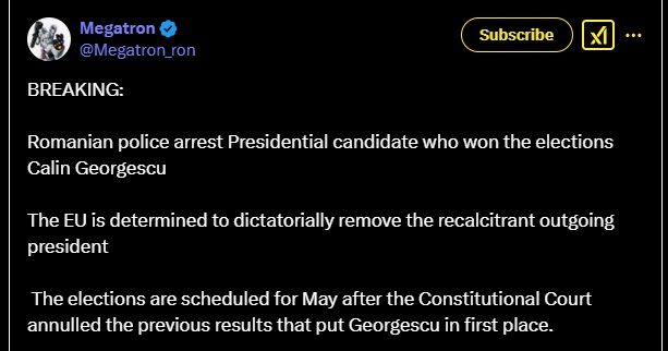 URGENT : La police roumaine arrête le candidat présidentiel qui a remporté les élections Calin Georgescu L'UE est déterminée à destituer dictatorialement le président sortant récalcitrant Les élections sont prévues pour mai après que la Cour constitutionnelle a annulé les résultats précédents qui donnaient Georgescu en première place.