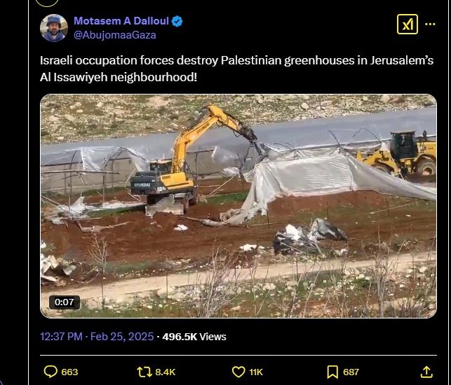 Israeli occupation forces destroy Palestinian greenhouses in Jerusalem’s Al Issawiyeh neighbourhood!