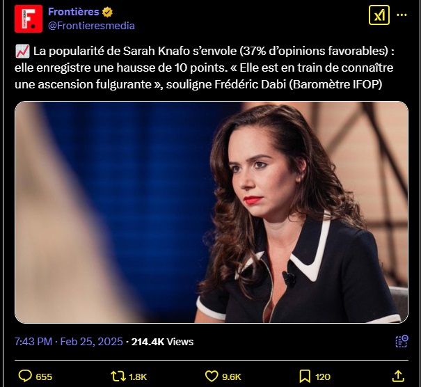 📈 La popularité de Sarah Knafo s’envole (37% d’opinions favorables) : elle enregistre une hausse de 10 points. « Elle est en train de connaître une ascension fulgurante », souligne Frédéric Dabi (Baromètre IFOP)