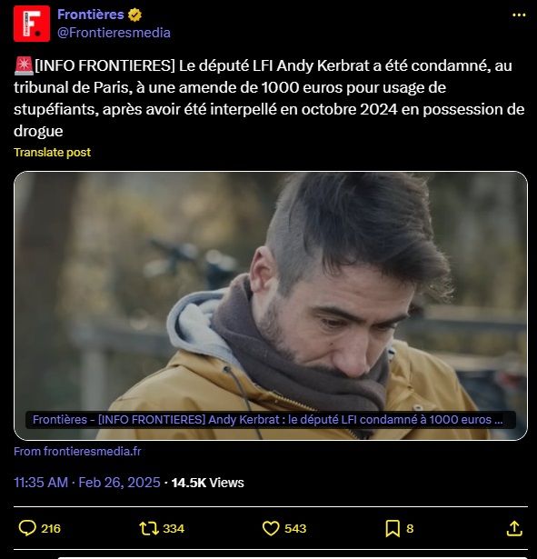 🚨[INFO FRONTIERES] Le député LFI Andy Kerbrat a été condamné, au tribunal de Paris, à une amende de 1000 euros pour usage de stupéfiants, après avoir été interpellé en octobre 2024 en possession de drogue