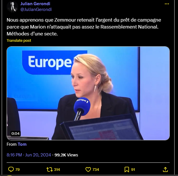 Nous apprenons que Zemmour retenait l’argent du prêt de campagne parce que Marion n’attaquait pas assez le Rassemblement National. Méthodes d’une secte.