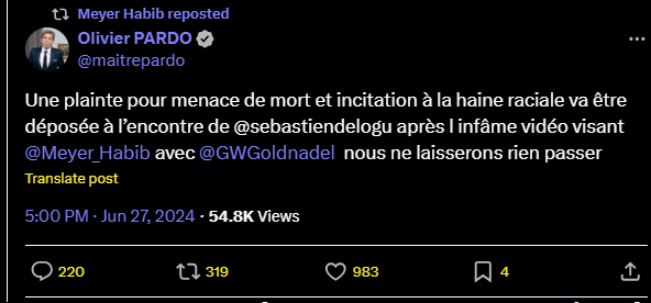 Une plainte pour menace de mort et incitation à la haine raciale va être déposée à l’encontre de @sebastiendelogu après l infâme vidéo visant