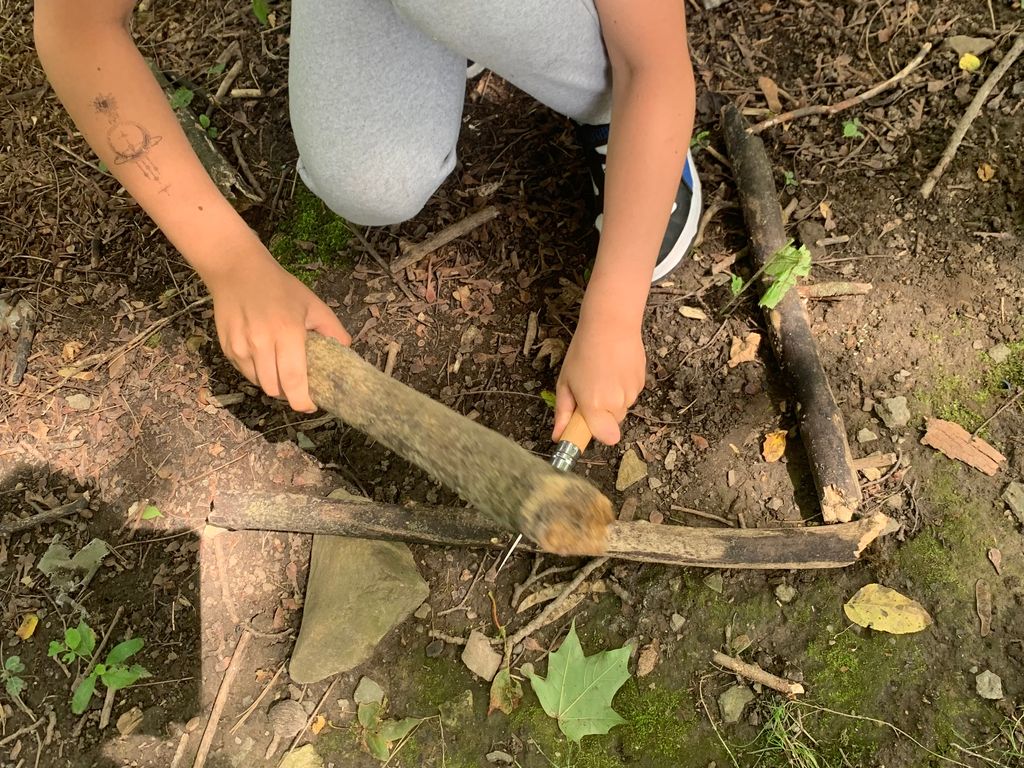 Premier apprentissage du gamin du bushcraft avec son opinel de poche pour commencer à être readyent
