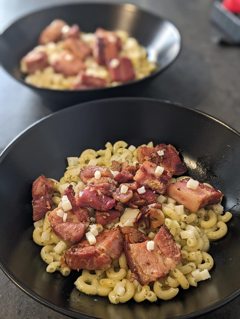 Avec poitrine de porc fumée cuite a feu doux avec de l'ail.