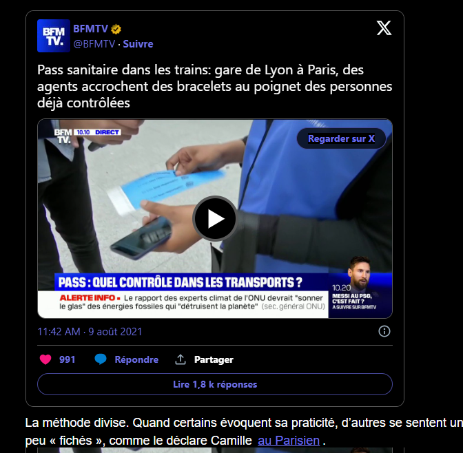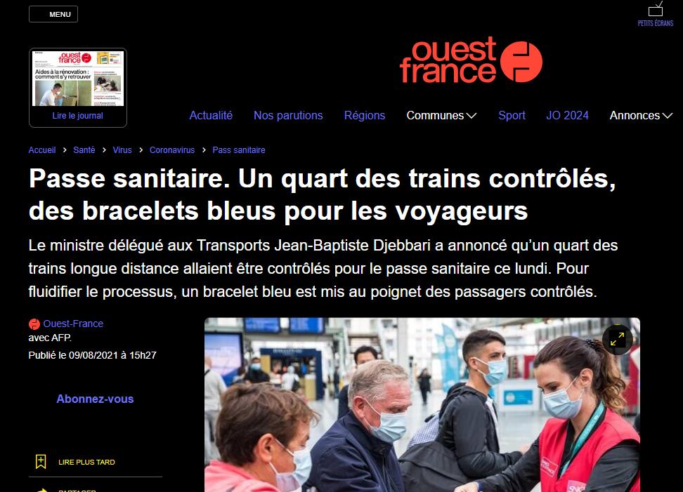 Le ministre délégué aux Transports Jean-Baptiste Djebbari a annoncé qu’un quart des trains longue distance allaient être contrôlés pour le passe sanitaire ce lundi. Pour fluidifier le processus, un bracelet bleu est mis au poignet des passagers contrôlés.