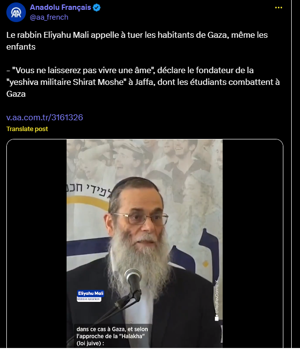 Le rabbin Eliyahu Mali appelle à tuer les habitants de Gaza, même les enfants