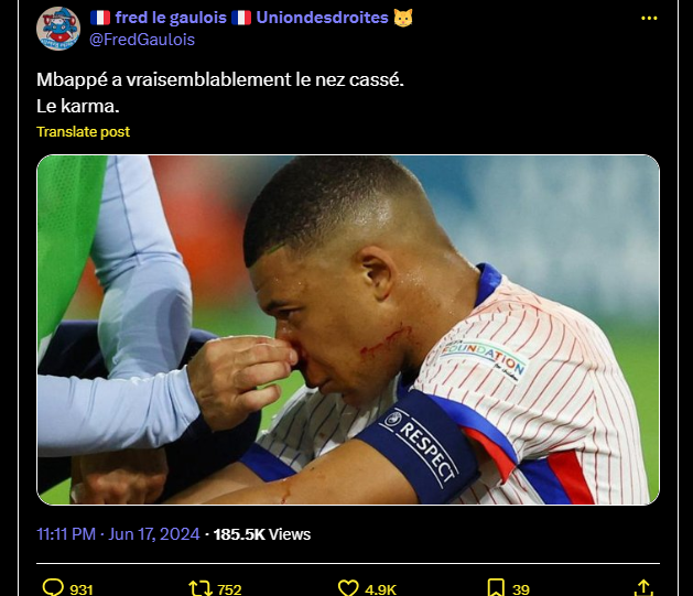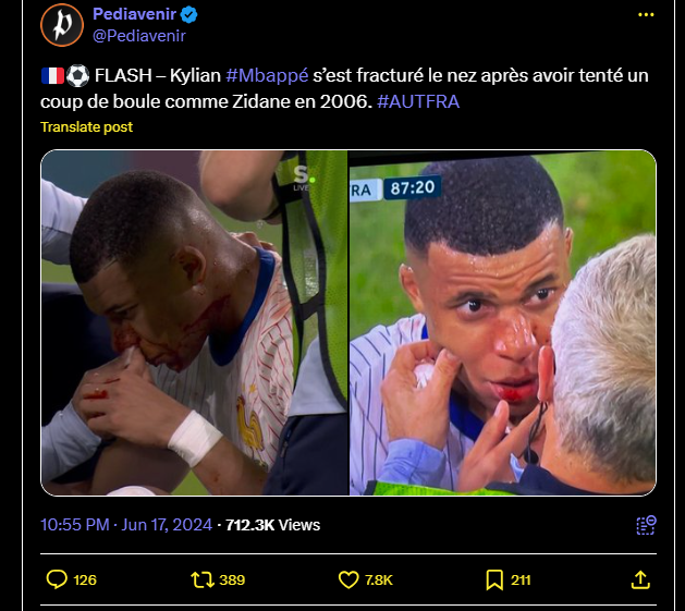 🇫🇷⚽️ FLASH – Kylian #Mbappé s’est fracturé le nez après avoir tenté un coup de boule comme Zidane en 2006. #AUTFRA