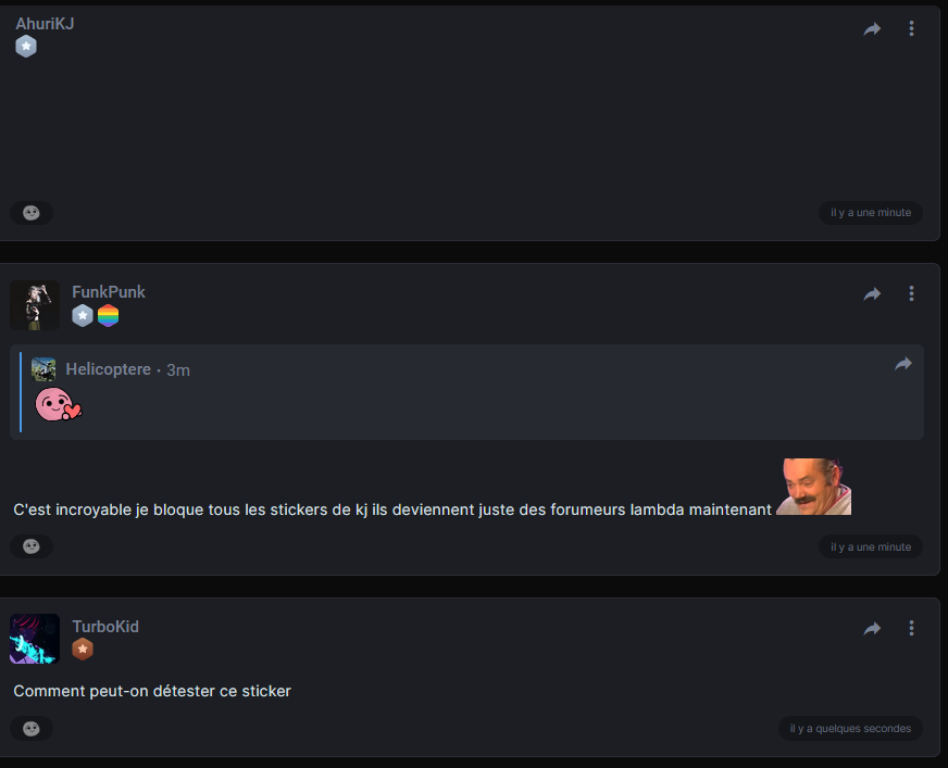C'est incroyable je bloque tous les stickers de kj ils deviennent juste des forumeurs lambda maintenant