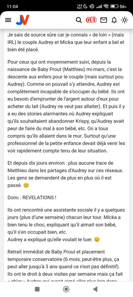La mère est totalement tarée depuis le début, elle s'empiffre de restau pendant qu'elle a pas de quoi nourrir son gamin qu'elle allaite pas car elle a la flemme, dit à moitié sur les RS qu'il la fait chier et qu'elle veut lui faire du mal, son gamin est placé elle s'en balek total et se plaint que les gens là critiquent...