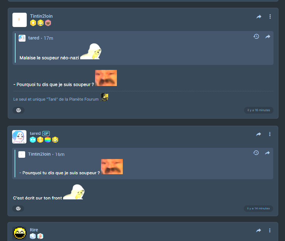- Malgré les tentatives de nombreux forumeur et de @Tintin2Ioin , @tared à continuer de lancer des provocations.. Nye.. ?