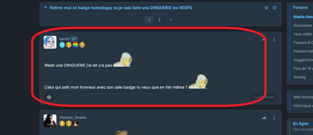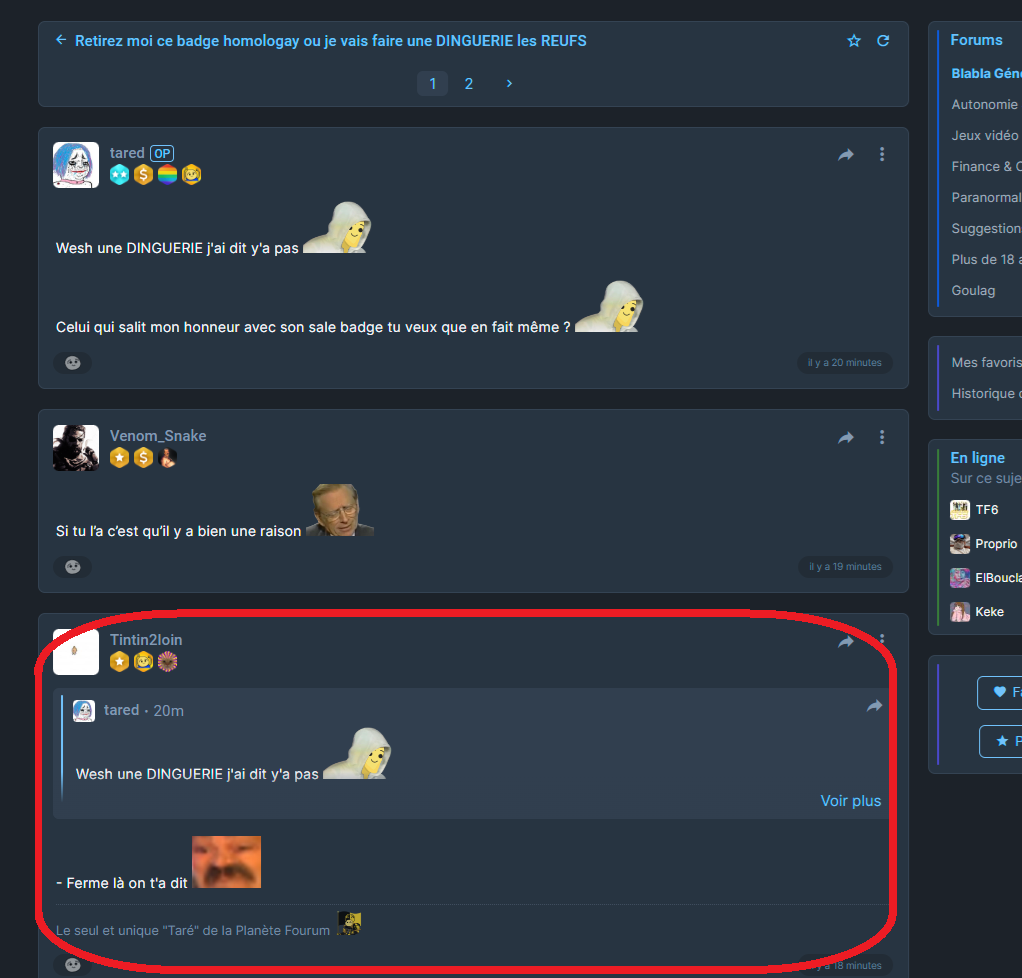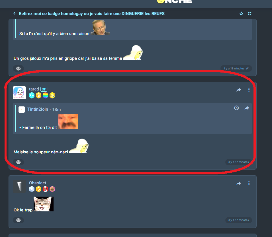 - Une personne dénommé @tared à ouvertement provoquer les administrateurs/modérateurs/développeurs du site Onche.org en critiquant l'offrande de badge qui lui a été fais