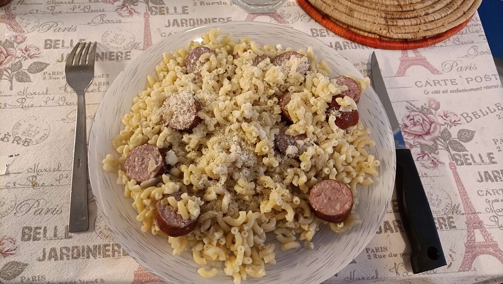 plat: coquillettes à la crème et parmesan, saucisse fumée
