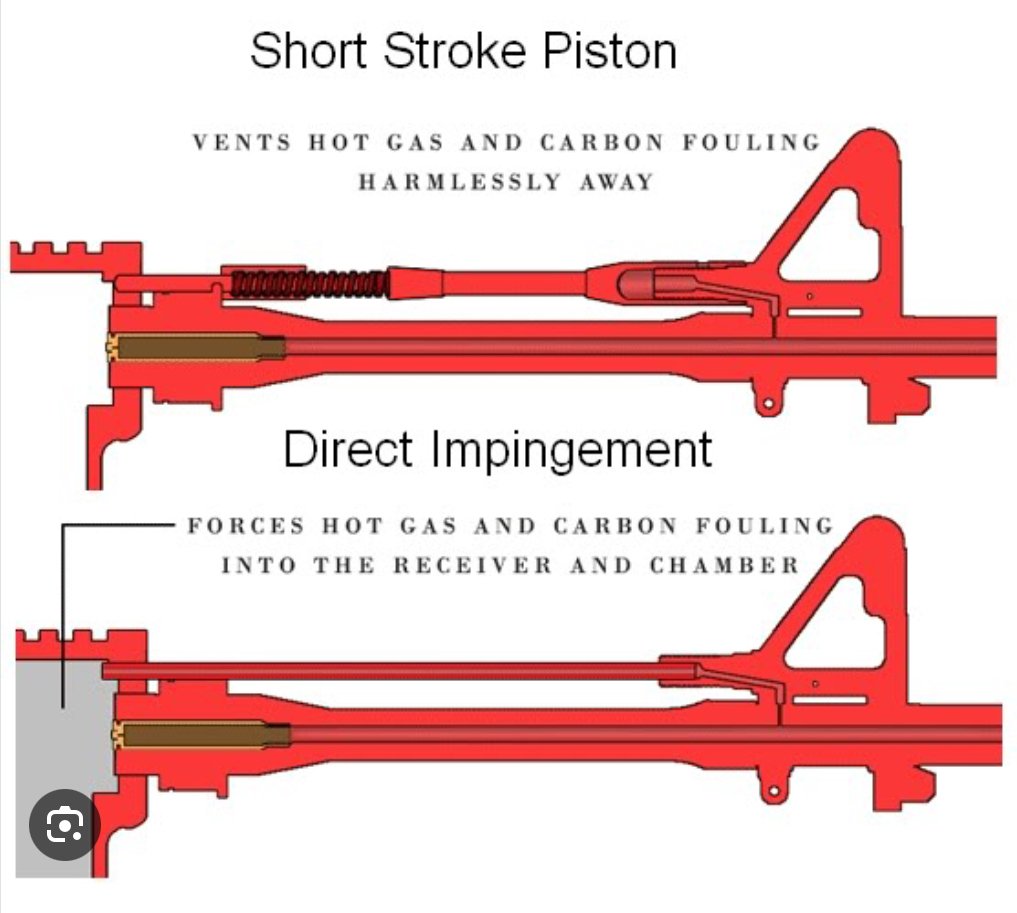 La différence c'est que dans un ar15 classique le gaz rentre dans l'upper receiver pour actionner le groupe percuteur alors que sur un système a piston le gaz ne fait que pousser sur un piston a l'extérieur du receiver qui actionne le système a l'intérieur