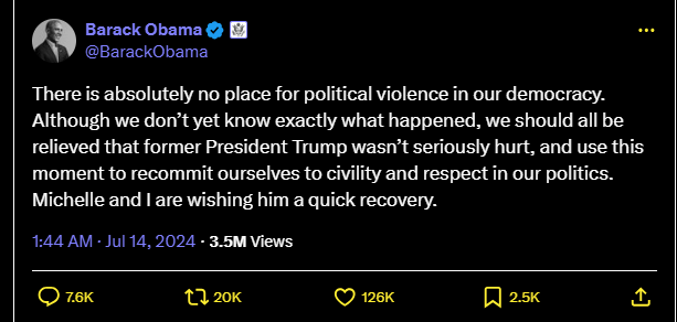 Il n’y a absolument aucune place pour la violence politique dans notre démocratie. Même si nous ne savons pas encore exactement ce qui s’est passé, nous devrions tous être soulagés que l’ancien président Trump n’ait pas été gravement blessé, et profiter de ce moment pour nous réengager à faire preuve de courtoisie et de respect dans notre politique. Michelle et moi lui souhaitons un prompt rétablissement.