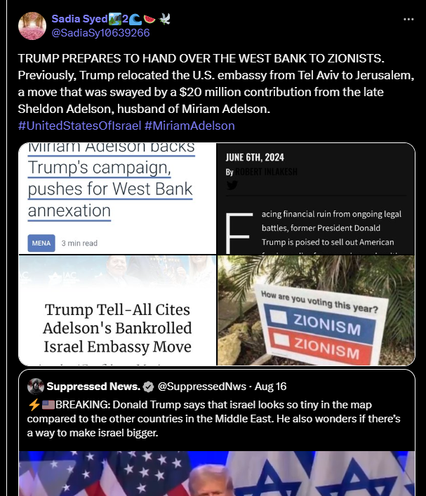 Trump se prépare à remettre la Cisjordanie aux sionistes. Auparavant, Trump avait transféré l'ambassade américaine de Tel Aviv à Jérusalem, une décision qui avait été motivée par une contribution de 20 millions de dollars de feu Sheldon Adelson, époux de Miriam Adelson.
