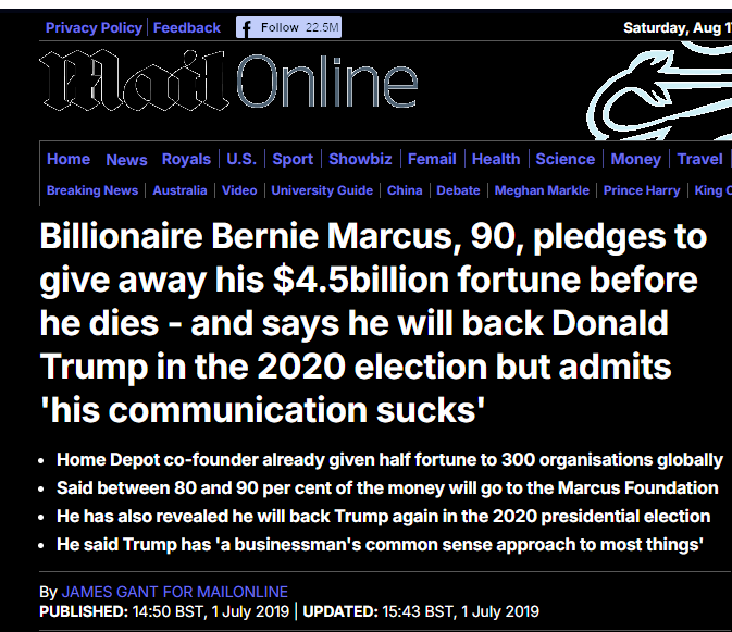 Le milliardaire Bernie Marcus, 90 ans, s'engage à donner sa fortune de 4,5 milliards de dollars avant de mourir – et dit qu'il soutiendra Donald Trump aux élections de 2020, mais admet que « sa communication est nulle »
