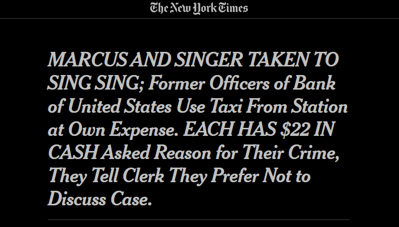 Bernard K. Marcus, ancien président de la Banque des États-Unis, et Saul Singer, qui en était vice-président, sont entrés dans la prison de Sing Sing à 17 heures ce soir pour purger des peines de trois à six ans pour détournement de fonds.