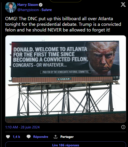 Près de 45 minutes après le début du débat, Biden a abordé la condamnation de Trump à New York. Lors d’une discussion sur l’insurrection du 6 janvier 2021, il a déclaré : « La seule personne sur cette scène qui est un criminel condamné, c’est l’homme que je regarde en ce moment même », en référence à Trump.