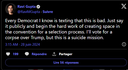 Biden, en revanche, semble affaiblit et a été mis en difficulté sur l'économie et l'immigration. Plus grave, il n'a pas réussi à capitaliser sur des sujets où il aurait dû être fort, comme l'avortement, avec des réponses peu claires et convaincantes. Sa performance a provoqué un vent de panique parmi les démocrates.