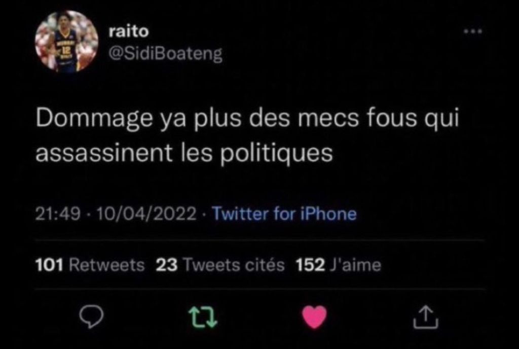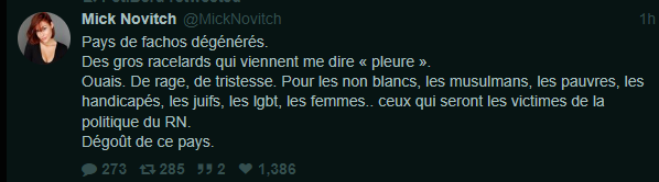 La seule chose que la gauche fait aux élections, permettre à un mondialiste de passer en agitant la diabolisation de ce qui fait la France historique. Les affirmations culturelles, le Mali aux Maliens, Mélenchon est un Macron bis, il a discuté avec Attali sur comment il faudrait imposer le modèle mondialiste mais avec différentes méthodes, c'est pour ça que ça donne l'impression dans le programme, que Mélenchon est différent mais le résultat reste de détruire la France dans son identité et si ça vote mal, ça veut faire barrage, ça montre que le vote sera inutile et qu'il faudra en venir à la violence ciblée sur les parasites.