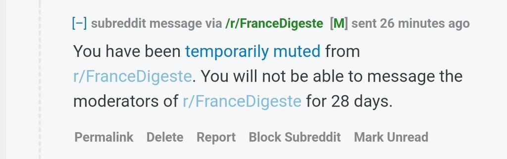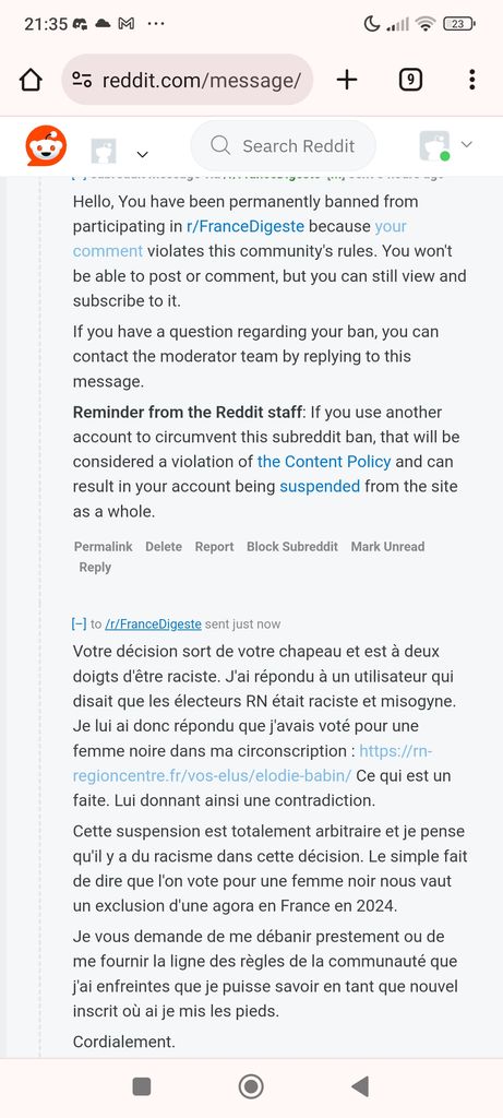 Ma dernière interaction fut une demande un peu plus poussive pour au moins avoir une réponse sur les règles de la communautéde raciste que j'avais enfreintes :