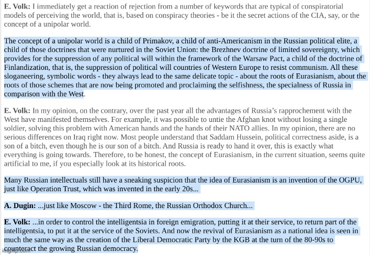 Ils ne combattent pas le nwo , ils veulent juste un ordre mondial différents ( multipolaire comme avant la chute de l'URSS ) , ils veulent la même chose que les États-Unis , l'hégémonie mondial mais avec une doctrine différente , des élites différente aussi