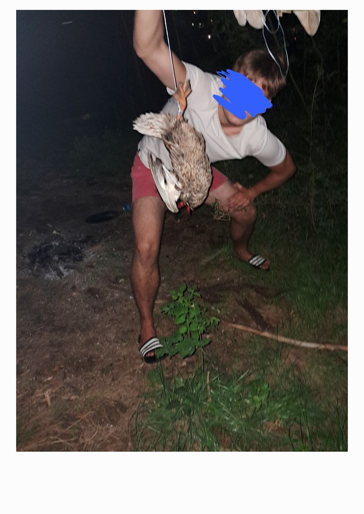 @bitacier l'a appâté avec du pain, moi je suis arrivé par derrière avec un gros caillou dans la main je l'ai paralysé avec jusqu'à l'agonie. Je l'ai choppé par le cou, j'ai tiré de toute mes force pour arracher sa tête et le tuer. Sans tête, il continuait à bouger.