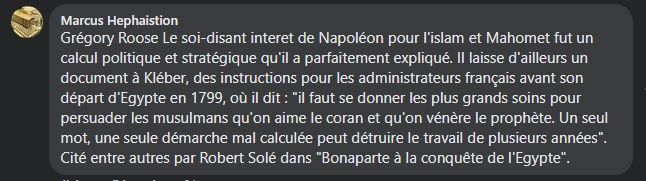 Napoléon faisait semblant d'aimer l'Islam par stratégie politique pour séduire lors de sa campagne d'Egypte notamment :