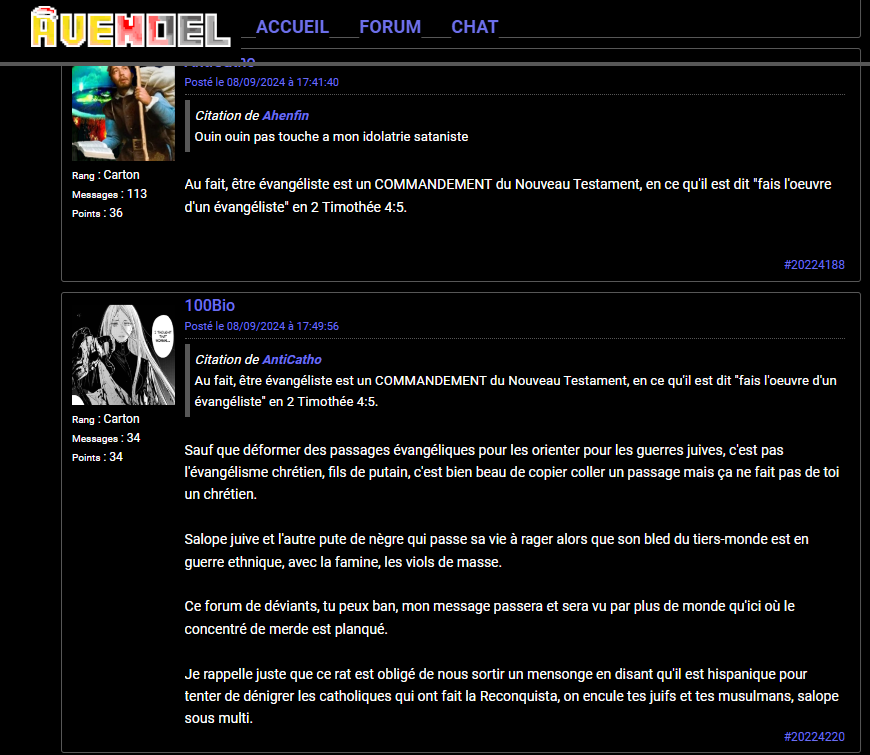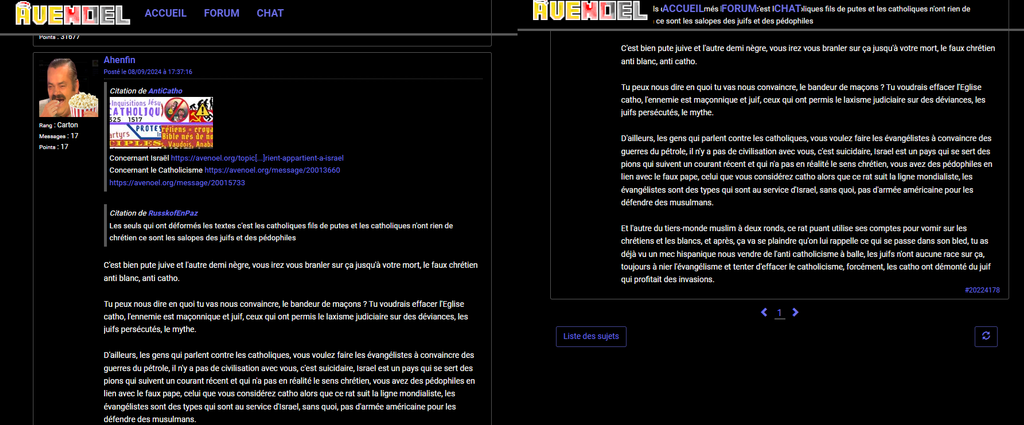Je vois que c'est un forum fabuleux avn, il faut avoir un niveau de cuckisme intersidéral. En fait, si vous parlez de nationalisme, de christianisme ou de votre race blanche, ça va venir en multi vous dénigrer et vous ban, c'est un forum francophone, c'est comme si je faisais un forum marocain et que je ban les Marocains fiers de leur pays, délirant. Après, les pédophiles qui sont bien reçus, ils sont pas bannis, eux.