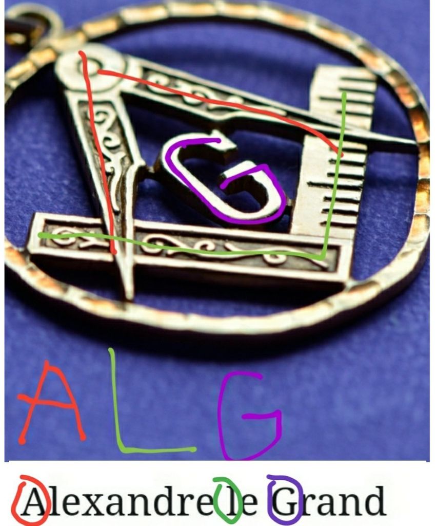 Les Franc maçons représente le Grand Architecte de l'univers avec un Équerre, un compas et un G. Nous pouvons faire les lettres ALG comme avec les initiales de Alexandre Le Grand. Le compas forme le A, l'équerre forme L et puis il reste le G