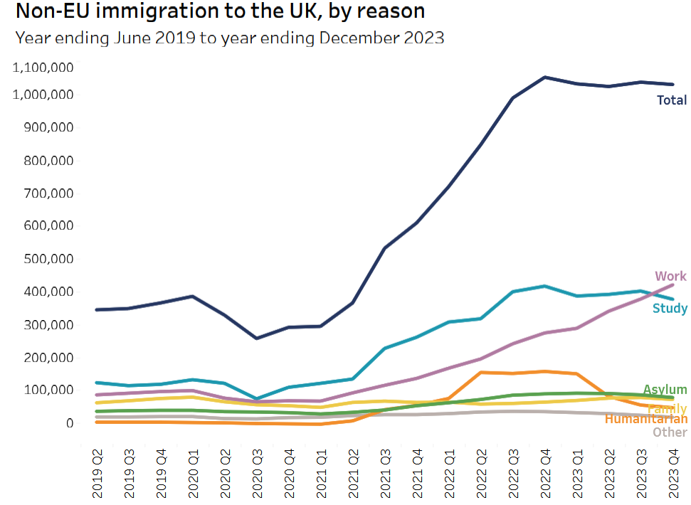 "ONS estimates show two main explanations for the 660,000 increase in non-EU immigration that took place between 2019 and 2023 (Figure 3):