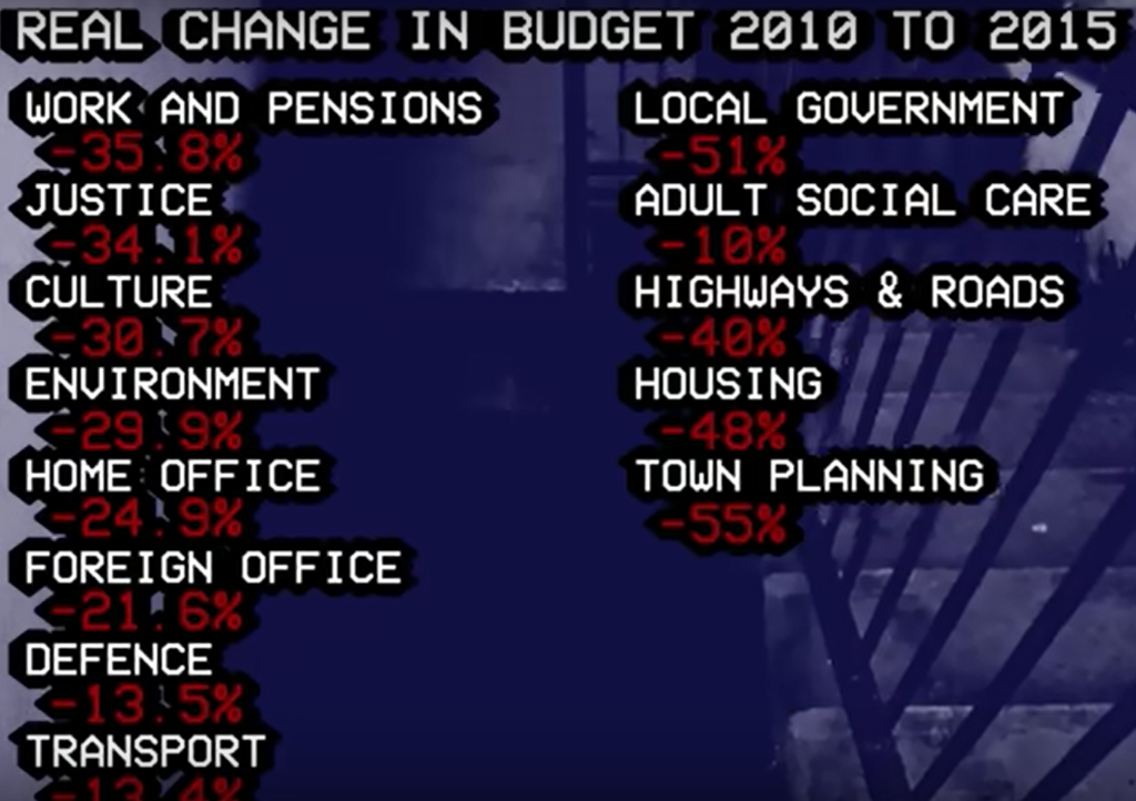 Depuis 2010, le budget des gouvernements locaux anglais a été réduit DE MOITIE. Pourquoi ? Afin de résorber le déficit public et de rembourser la sacro-sainte dette de la crise de 2008. Vous savez, cette dette provoquée par l'avarice des gros banquiers ? Hé bien c'est l'anglais lambda qui va devoir payer.